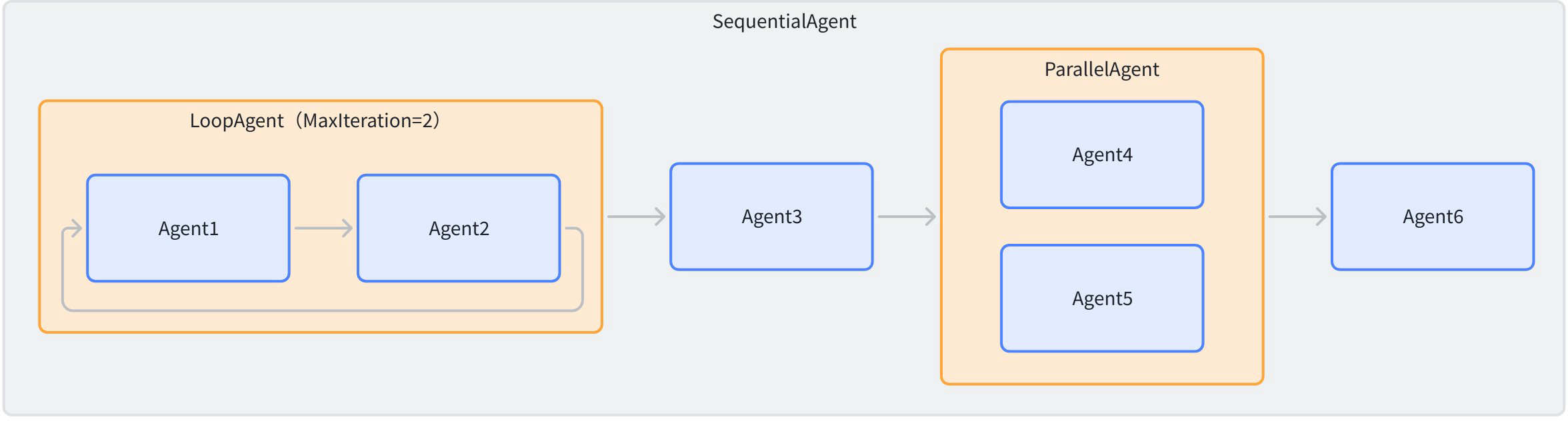 WorkflowAgent runs agents according to a preset flow. ADK provides three base Workflow agents: Sequential, Parallel, and Loop. They can be nested to build more complex tasks.