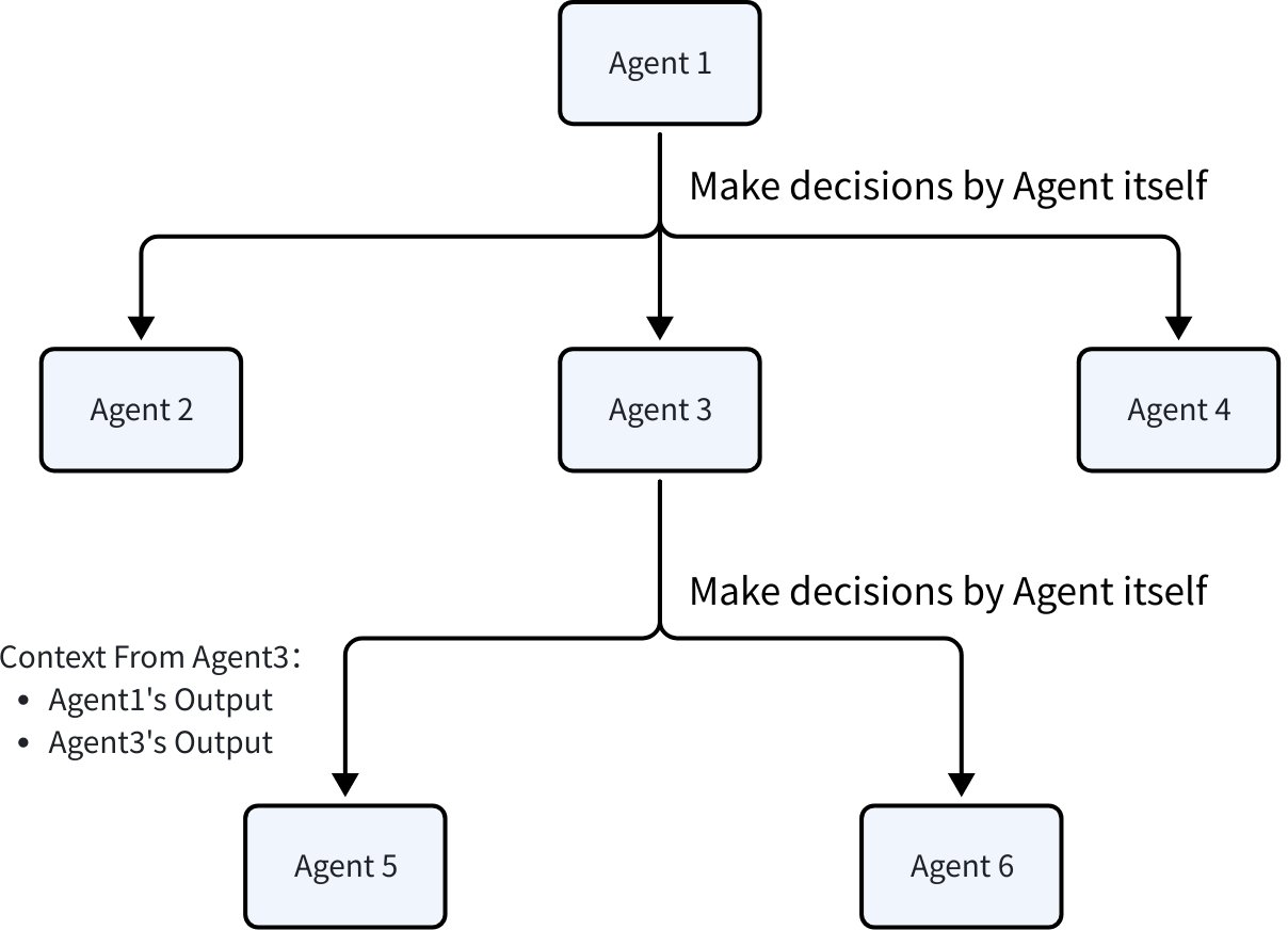 Mode Description Transfer Hand off the task to another agent. The current agent exits and does not wait for the child agent’s completion. ToolCall (AgentAsTool) Treat an agent as a tool, wait for its response, and use the output for subsequent processing. -