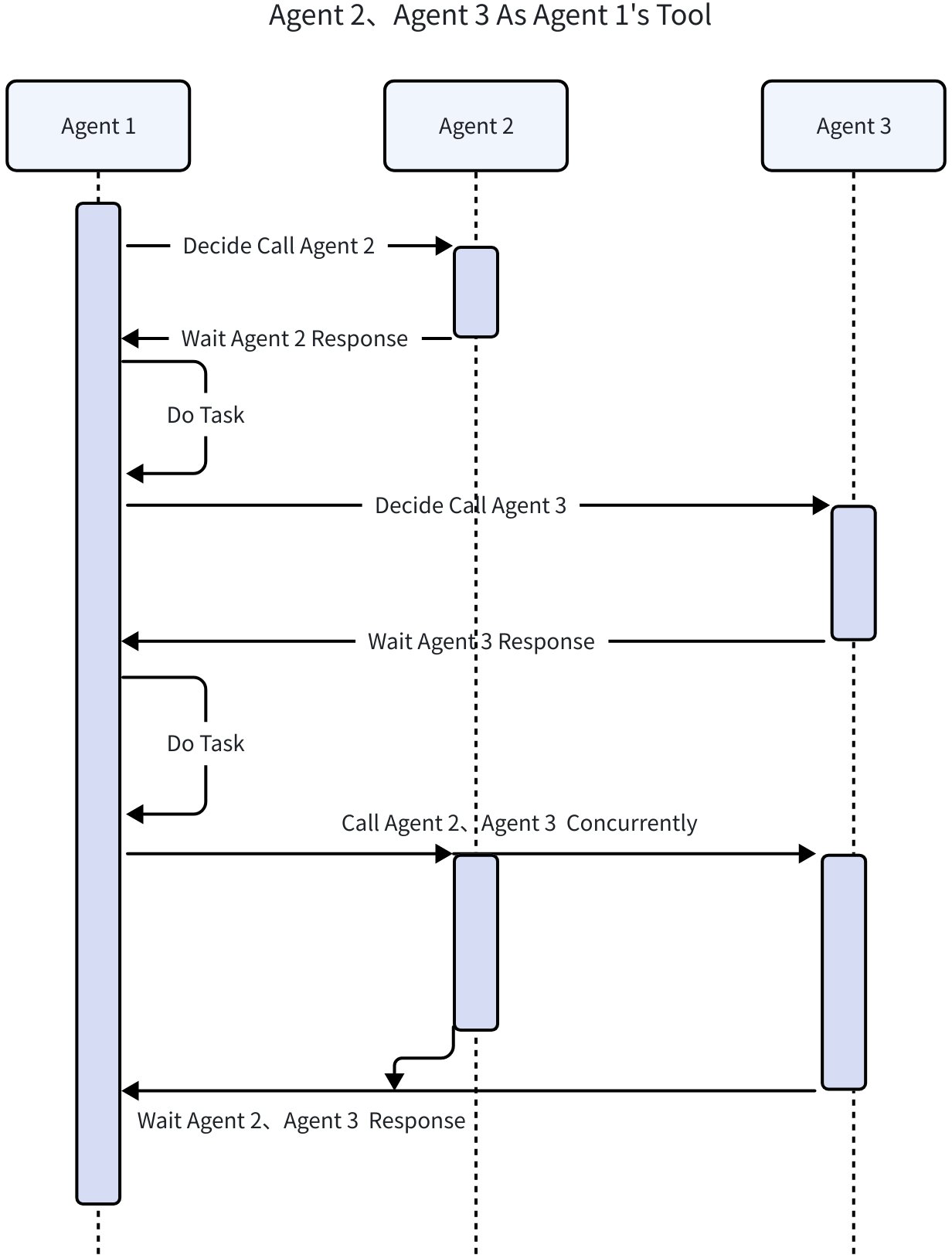 | ToolCall (AgentAsTool) | Treat an Agent as a tool call, wait for its response, consume its output, and continue processing |