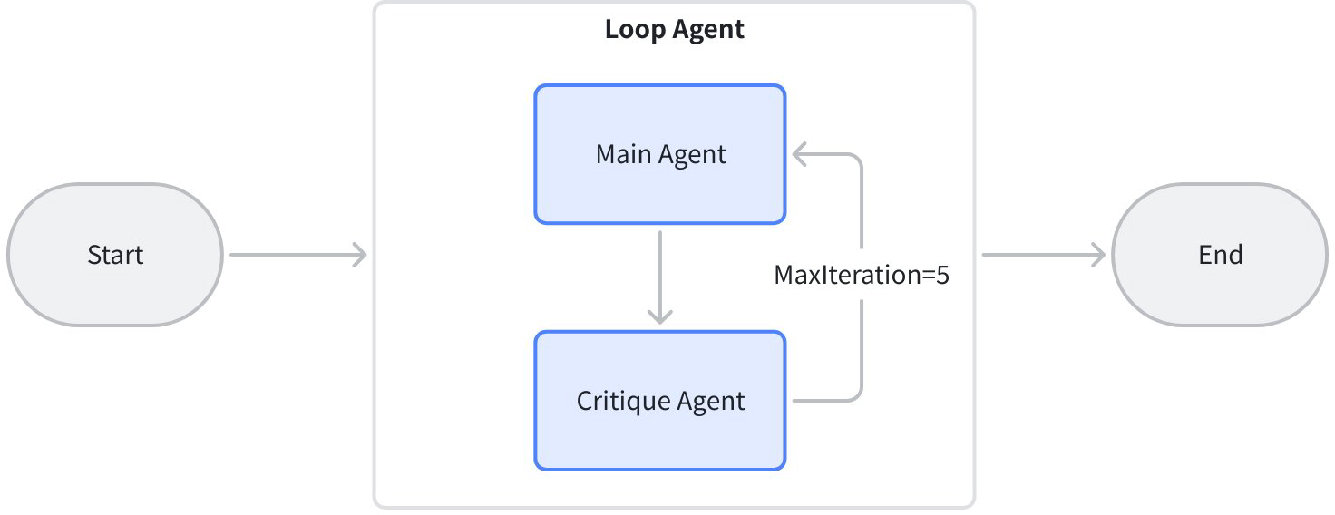 • Loop workflowBuilt with LoopAgent to form a reflection‑iteration framework.