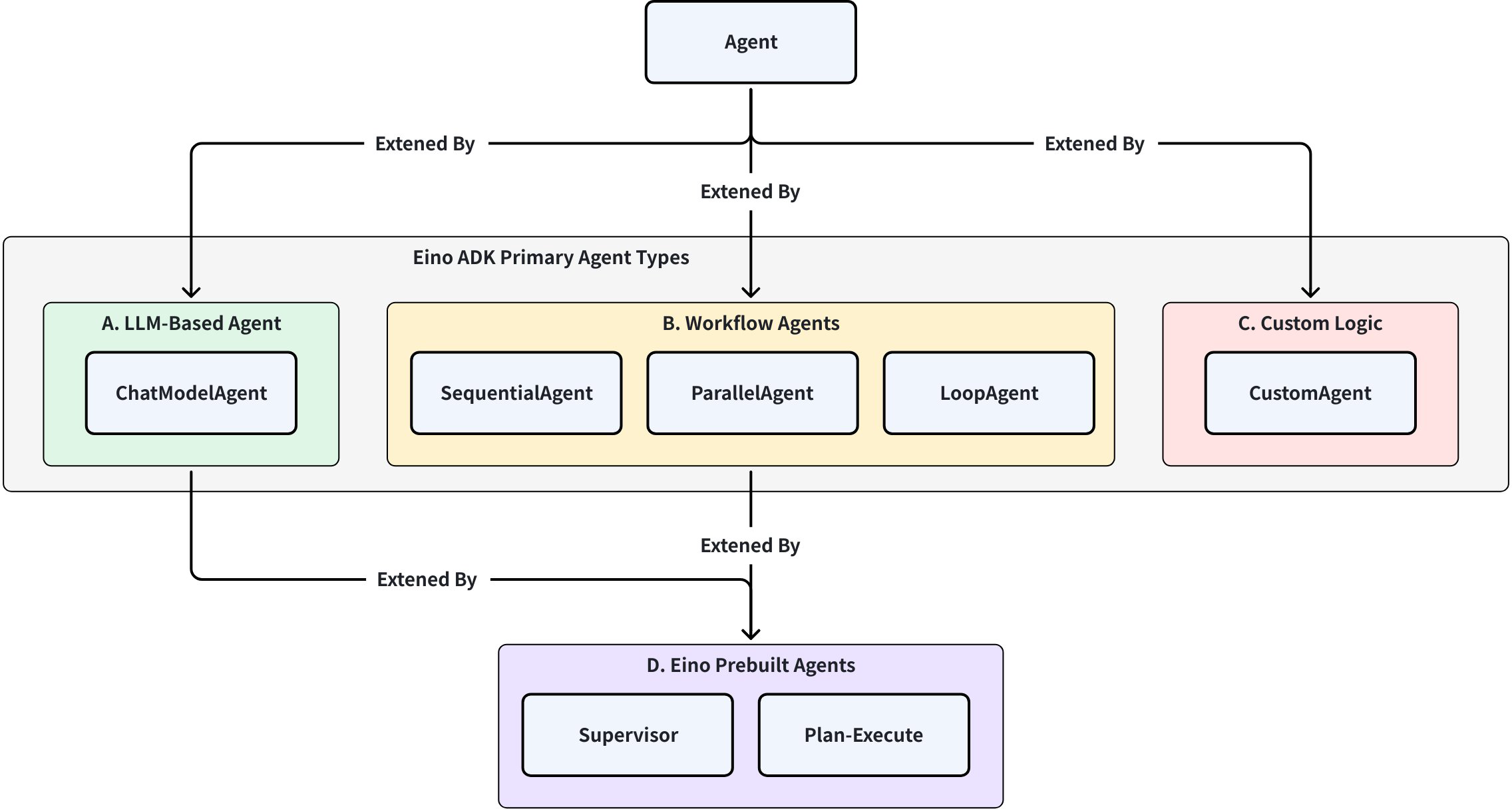 CategoryChatModel AgentWorkflow AgentsCustom LogicEinoBuiltInAgent (supervisor, plan‑execute)