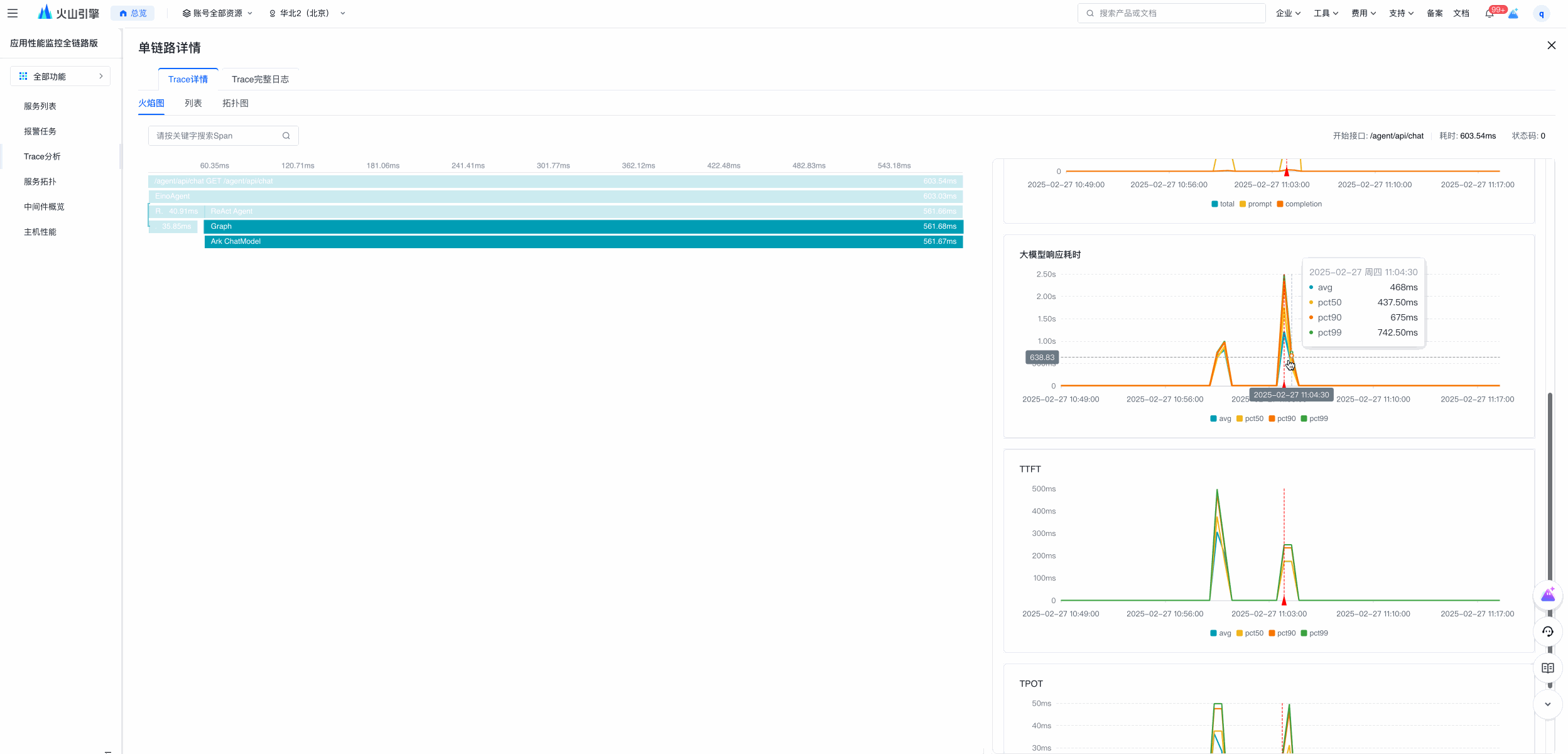 Eino provides APMPlus tracing and metrics wrappers based on graph callbacks. See APMPlus docs and console. Example: